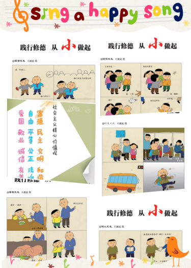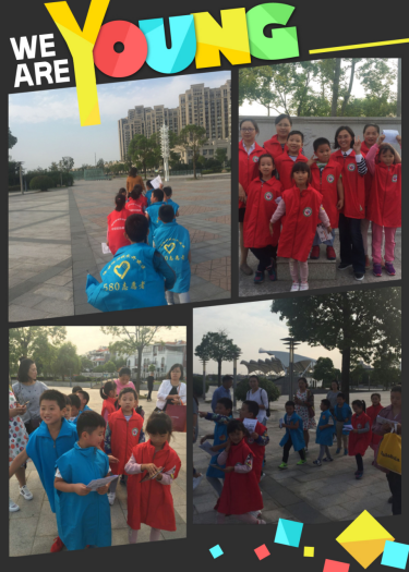 这是班上宋承煊小朋友的妈妈精心为孩子们准备的宣传资料,“践行修德 从小做起”,宣传资料中用漫画的形式直观形象地讲述了行走之礼、仪式之礼、餐饮之礼、游览之礼、交谈之礼、待人之礼、观赏之礼等生活礼仪,引导广大民众以社会公德、职业道德、家庭美德和个人道德为着力点,加强道德建设,弘扬文明新风,共建和谐社会。瞧!我们的小小志愿者穿上靓丽的志愿服,拿上宣传资料,兴致勃勃地出发啦!那天蓝色的志愿服仿佛是水滴的颜色,每个孩子都象征着一滴水,汇进公益的海洋;那鲜红色的志愿服仿佛是孩子们火热的心,照亮公益的道路。