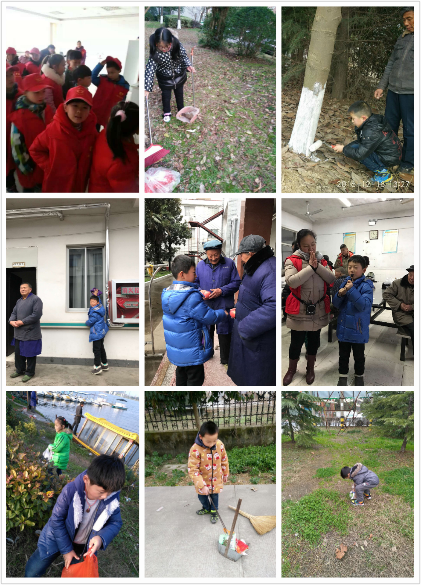 爱心温暖你我,幸福传递大家 发布时间:2017-01-04 00:00:00 浏览次数: 次 【字体:小 大】 在城南实小二1班,“温暖自己,幸福他人”的幸福公益口号已经像种子一样深深地扎根于每个孩子的心田。每到周末节假日,在街道,在社区,在敬老院,总会有孩子们忙碌的身影。瞧,慰问老人,给小树穿冬衣,社区打扫,参加志愿者活动……他们人小但爱心不小志气不小,他们用自己的行动为大家带来了春天般的温暖! 分享到: 【打印正文】