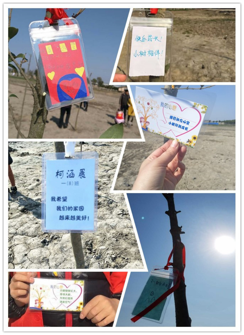 小朋友们在亲手种下一颗颗小树苗的同时,也体会到绿色的珍贵和生命的价值。他们在给小树们做树牌呢,每一张树牌都是小朋友们自己创作的,有的画上了自己,有的写了要与小树一起成长。