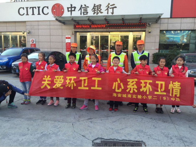 二(9)中队向环卫工人学习他们那种吃苦耐劳的精神。关爱他们,为他们提供力所能及的帮助。走进环卫工的世界,给他们带来温暖。也正是有了他们的辛勤劳作,我们的这座城市才会干净整洁。关爱环卫工人 珍惜环卫成果,我们的城市才会变得更加的靓丽。