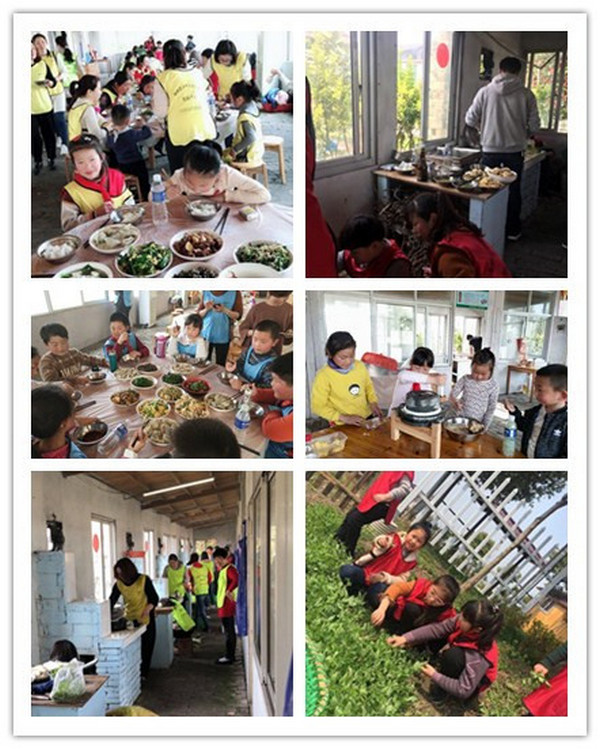 植树活动结束后,大家一起去田园采摘蔬菜,体验农事劳作,在家长的协助下体验土灶做饭。