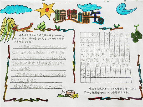 “粽叶飘香 情系端午”——城南实小一3班端午特色活动 发布时间:2018-06-19 00:00:00 浏览次数: 次 【字体:小 大】 端午近,粽香飘。在端午佳节临近之际,为大力弘扬中华优秀传统文化,弘扬和践行社会主义核心价值观,让队员们深入了解传统节日、认同传统节日、喜爱传统节日,本中队举办了“粽叶飘香 情系端午”包粽子特色活动。从了解端午习俗包粽子历史之久,到亲自体验包粽子之乐,尝粽子之味,最后写包粽子之趣。一点一滴感受传统节日。 分享到: 【打印正文】
