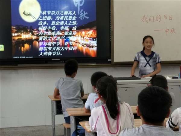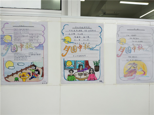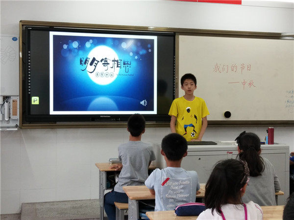 活动中,同学们纷纷走上讲台,或绘声绘色地讲中秋传说,或抑扬顿挫地读中秋诗词,或声情并茂地演唱中秋歌曲,互动交流,笑声不断,场上气氛十分热烈。然后,同学们还将自己前期制作的中秋小报进行了展示,并张贴在教室外墙上,让大家互相学习。同学们在谈中秋、诵诗词的过程中感悟到团圆、和谐的幸福,增进了同伴之间的友谊。