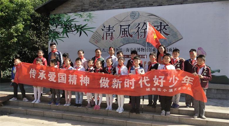 今天是祖国妈妈69岁的生日,为了传承红色精神,江苏省海安市城南实验小学四1满天星中队的队员们在辅导员老师的带领下走进了爱国人士、曾经的江苏省省长韩国钧先生的故居。在讲解员的精彩解说下,队员们看地砖、桌椅、花瓶等,了解了韩老故居徽派建筑与西洋建筑合二为一的建筑艺术;通过看展板、听讲解,队员们充分感受到韩老先生对家乡的热爱,对教育事业的热爱,感受到老先生坚决抵抗外侮以身殉国的豪情壮志。