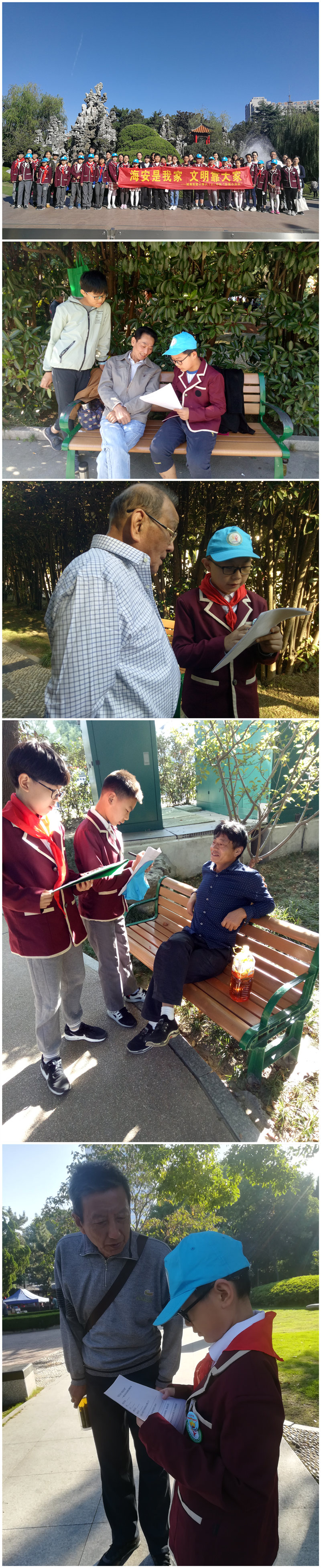 你瞧,早上七点一刻左右,就有穿着校服,头戴班帽的孩子在海陵公园门口聚集。七点三十分,活动正式开始。孩子们带着事先准备好的调查表、问卷和垃圾捡拾工具,分组展开活动。