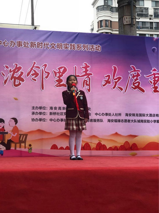 金秋时节,重阳将至,为弘扬中华民族尊老、敬老的传统美德,提高老年人们的生活质量。10月14日,我们三2中队的队员们参加了由海安市高新区中心办事处主办的“浓浓邻里情,欢度重阳节”活动。