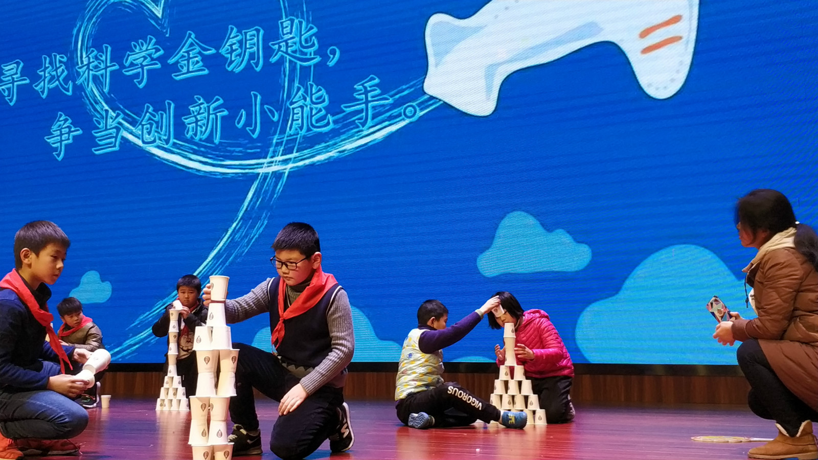 12月21日下午第一节课,期待已久的科技节“纸杯叠叠乐”总决赛在幸福剧场拉开帷幕。