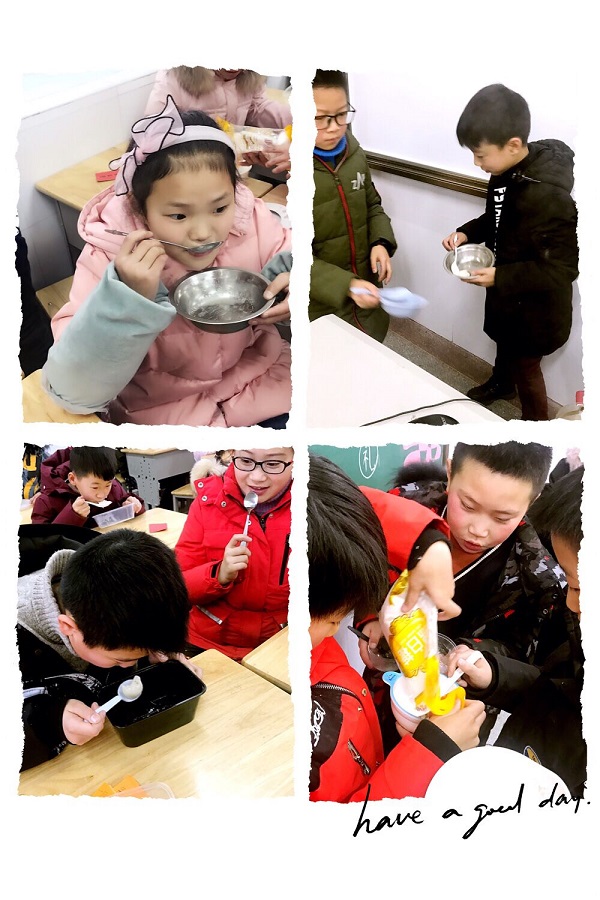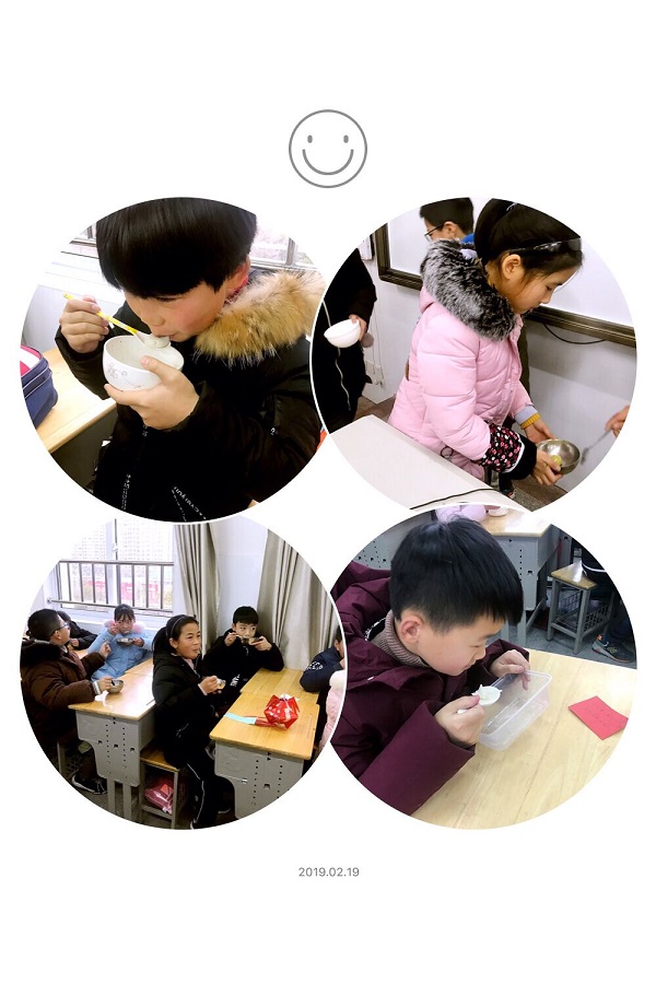 “吃汤圆了!”随着一声吆喝,同学们一起分享大家亲手做的汤圆。看着白乎乎、圆滚滚的汤圆,大家吃在嘴里,甜在心里。