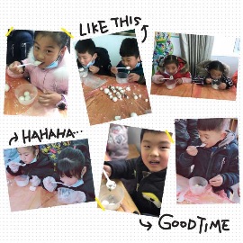 家长义工和老师们介绍了汤圆的制作方法和步骤,我们模仿搓起了汤圆。