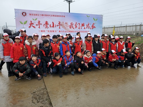 活动开始,三塘村领导讲述了植树节的传统由来,徐逸芃同学代表全体师生宣读了倡议书。植树活动开始后,同学们小心翼翼地扶着树苗,用铁锹把土填满,今天下着小雨,他们身上到处溅得都是泥浆,但是依旧干得热火朝天。有了前两年的经验,同学们最终顺利完成了栽种工作。植树完成后,他们在活动板上留下了小手印。