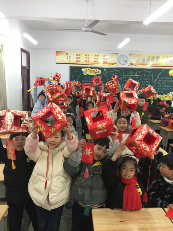 教室里热闹极了,大家在制作火红火红的压岁包灯笼,灯笼下挂着各种类型的谜语,大家三五成群的聚集在一起,或独自思考,或相互讨论;而猜出谜底的同学则手拿谜面,高呼着“我猜出来了,我猜出来了”。