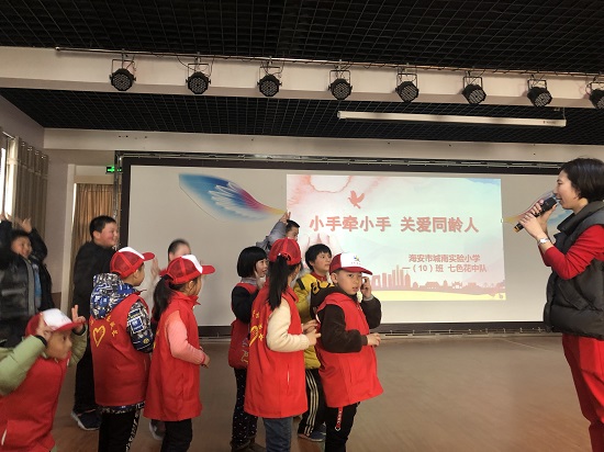 3月19日下午,海安市城南实验小学一(10)七色花班的孩子们在家长们的带领下,前往海安特殊学校看望慰问在校儿童,并与他们互动游戏,还相互献上了各自的节目。