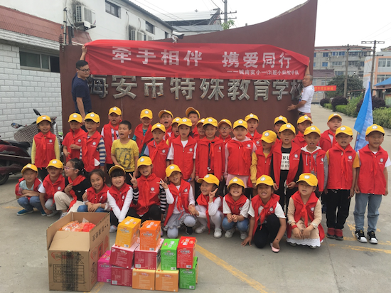 5月30日,城南实验小学一(3)班的小蚂蚁们光荣地加入了少先队。5月31日下午,小蚂蚁们就用实际行动争做了新时代的好队员。他们佩戴着鲜艳的红领巾,走进海安市特殊教育学校,开展了“牵手相伴,携爱同行,与特殊儿童共庆 ‘六一’”的送爱活动。