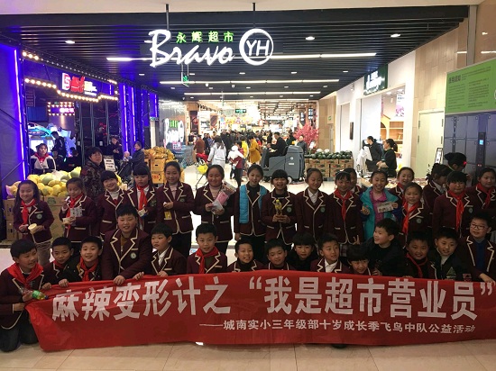 周末,我们城南实验小学三(3)飞鸟中队的孩子们走出教室,走进星湖001永辉超市,进行了一次以“麻辣变形计之我是超市营业员”为主题的公益活动。