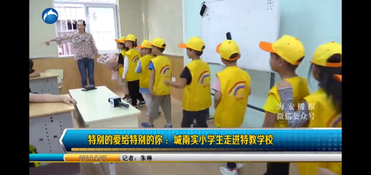 24日下午,城南实验小学一(7)班的志愿者代表带着鲜花和孩子们喜爱的图书绘本来到了海安特殊教育学校,与特教的孩子们一起画画、折纸、玩游戏,欢声不断笑语满天,孩子们玩的不亦乐乎。特教学校的老师说,城南实小的孩子和家长们带来的不仅是物质上的关爱,更重要的是精神上的鼓舞。海安电视台的记者跟随采访了我们这次“特别的爱给特别的你”见面会活动,并且在海安电视台《民生热线》栏目播报了我们这次活动,以此来呼吁大家关注特殊儿童。