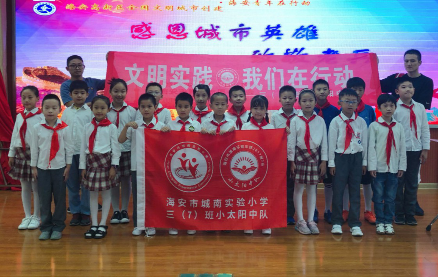 五位少先队员代表给爷爷系上了鲜艳的红领巾,并列队向老战士们敬礼,队员们为老战士们献唱了《中国少先队队歌》,并表演了诗朗诵、舞蹈、架子鼓、活力足球等节目。91岁的杨爷爷给队员们讲述了他参加红军、抗日战争及解放战争的英勇事迹,杨爷爷勉励队员们从小要爱党、爱国、爱人民,树立民族自尊心和自信心,将来为祖国建设贡献力量。