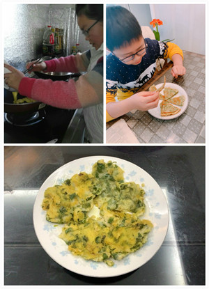关于杨柳摊饼的历史故事激发了队员们深入探究的欲望,他们争相研究杨柳摊饼的制作流程,并在中队线上学习群积极分享,相约要体验一把制作杨柳摊饼的乐趣。1.摘。制作柳叶摊饼要选柳树的鲜嫩的芽叶。2.切。将采摘柳叶择洗干净、切碎备用。3.和。将切碎的柳叶倒进和好的面糊里进行搅拌直至均匀,如果再加两个鸡蛋,味道更佳。4.煎。将和好的柳叶面糊倒进热好的油锅,小火油煎,直至饼色金黄即可。5.出。将煎好的柳叶煎饼用铲子盛出锅装盘,摆好造型,小心热油。6.品。将出锅的柳叶煎饼配上各自喜欢的调味品,就可以大快朵颐了。