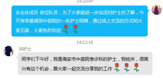 洪阿姨通过班级群视频和队员们进行了互动,给队员们讲述了护士的工作日常、自己工作以来记忆深刻的故事以及工作背后不为人知的艰辛。队员们这才知道护士阿姨们平时也会受到很多委屈,有很多意想不到的紧急情况需要处理,不禁对护理工作产生了更多的敬意,纷纷表示要尊重医护工作者。同时,洪阿姨还对队员们提出的疑问一一作了解答,从健康知识到日常生活细节,从关爱自身到关爱家人,队员们受益匪浅。
