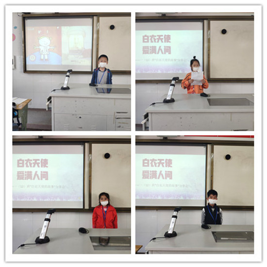 在接下来的活动中,一(12)班的孩子们分享了自己搜集到的白衣天使的故事,生动传神的语言为我们描绘了一幅幅无私奉献的画面,孩子们仿佛身临其境,纷纷被医护人员不畏艰苦、甘于奉献的精神深深感动。一(8)班的学生代表准备了《听我说谢谢你》手势舞,整齐划一的动作表达了对费榕姐姐等一线工作者崇高的敬意。