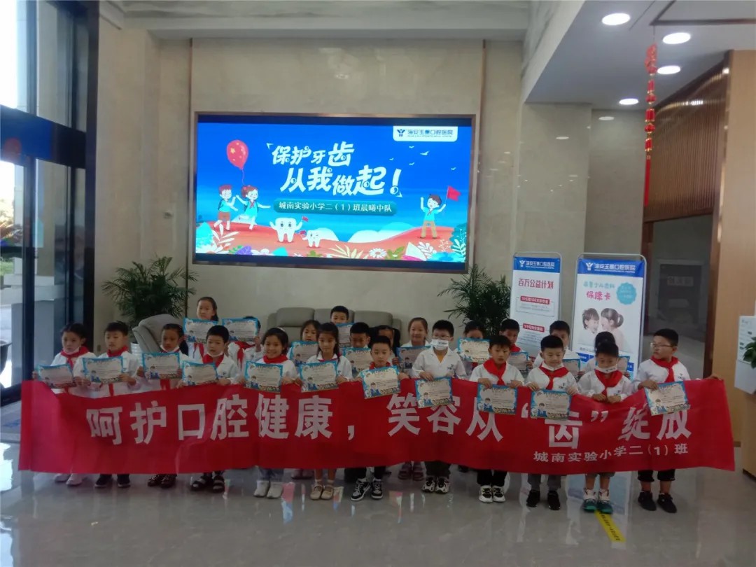 口腔保健是人类文明进步的象征,每个人都希望自己有一口洁白、整齐的牙齿,而关键在于从小要打下好良好的基础。通过此次“爱牙日”主题公益活动的,学生不仅对口腔健康的重要性有了充分认识,从中懂得了爱牙护齿的相关知识和技能,增强了口腔健康观念和自我保护口腔健康意识,更引导他们从现在做起,从细节做起,养成保护牙齿的好习惯。国庆快乐,健康常在,愿城南实验小学二(1)班的每一个护牙小卫士,绽放出最健康、最美丽、最童真的笑容!