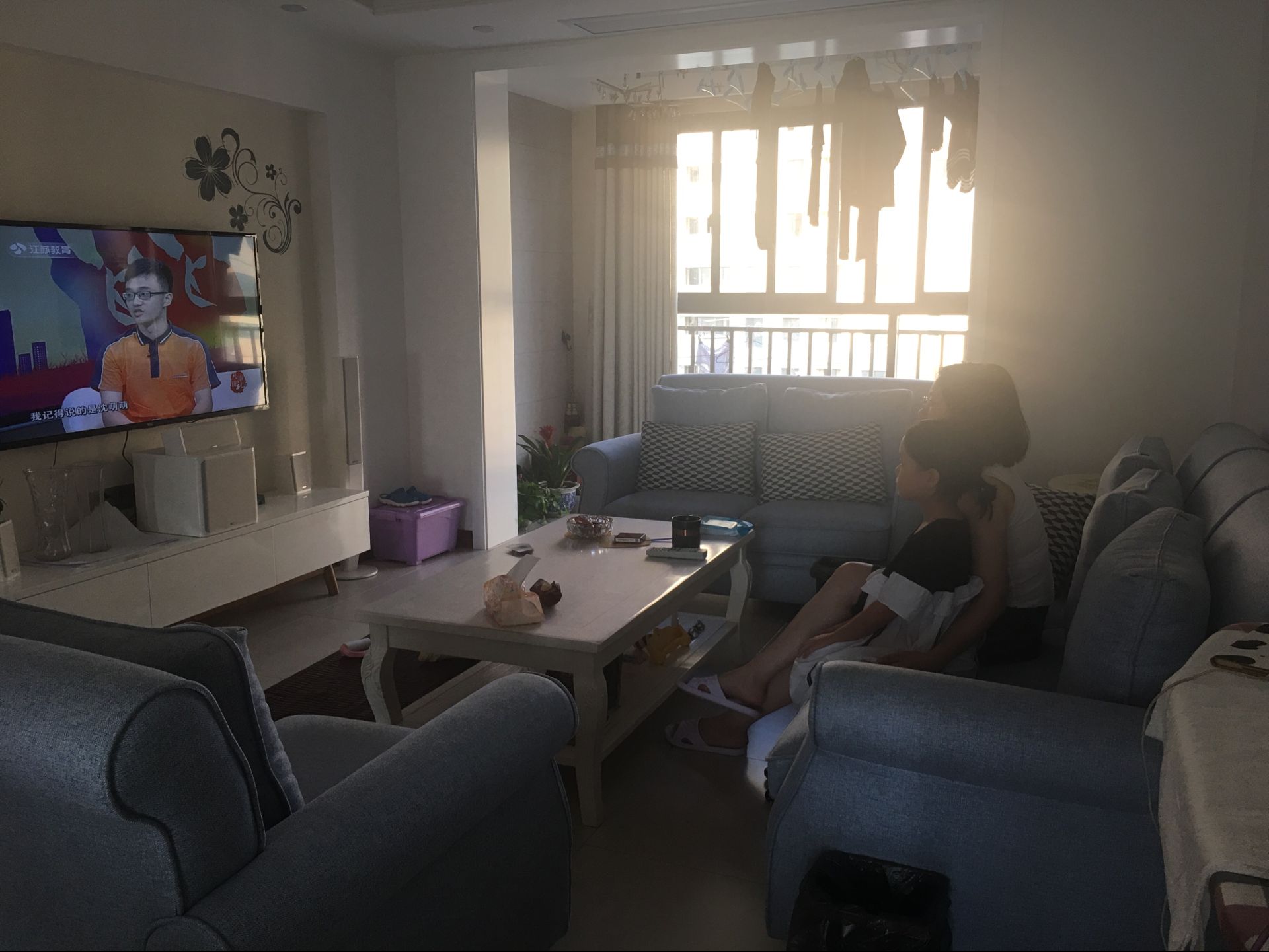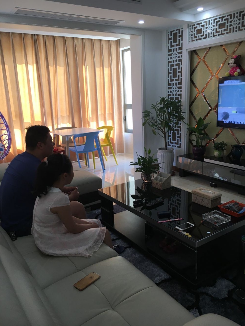 (图为家长和孩子们一起收看电视节目)