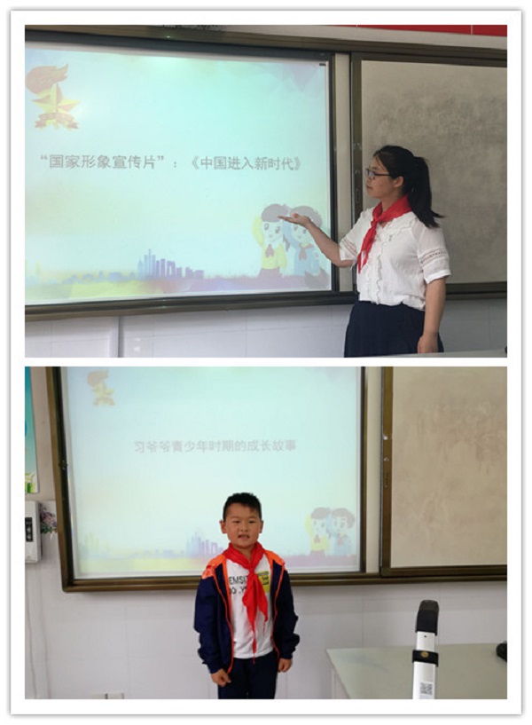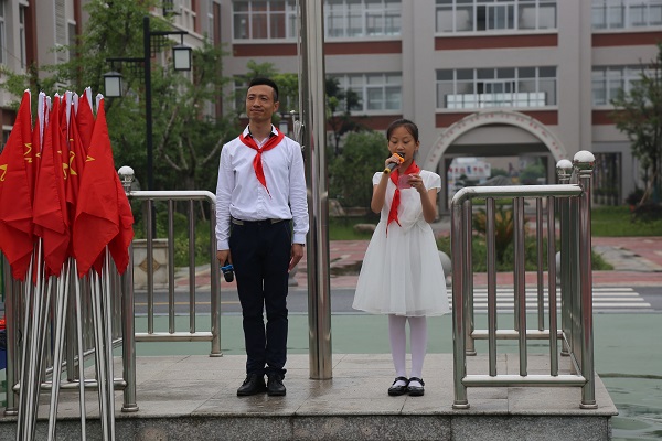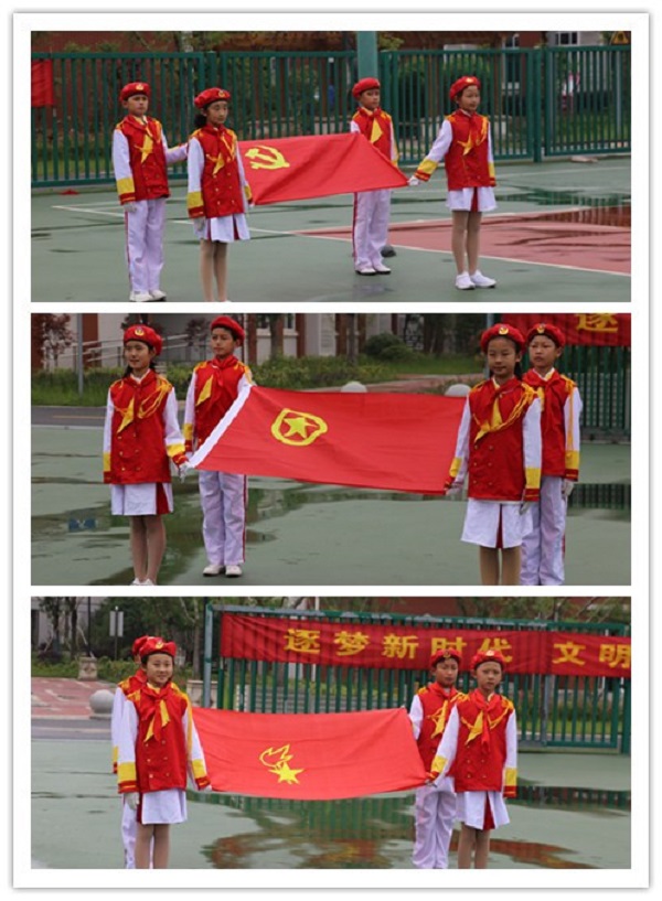 在许校长的感召下,在主持人的引领下,所有的少先队员一起高声喊出了我们的口号:“领巾飞扬心向党,争做时代好队员!”