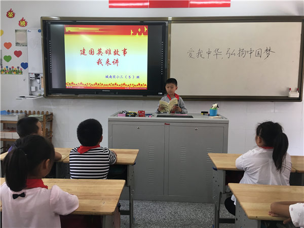 三年级部在活动中组织学生观看了开国大典的视频,讲述了建国英雄的故事,练唱了国歌,动手制作了五星红旗,向国旗庄严敬礼,用歌声与巧手行动表达了对祖国妈妈的尊敬和热爱。
