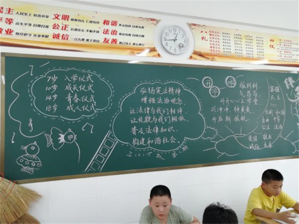 3.班级出一期以法治或《宪法》为主题的黑板报。全校79个班(东校区72个班,西校区7个班)围绕法治和《宪法》出了一期黑板报,对学生进行《宪法》宣传教育。