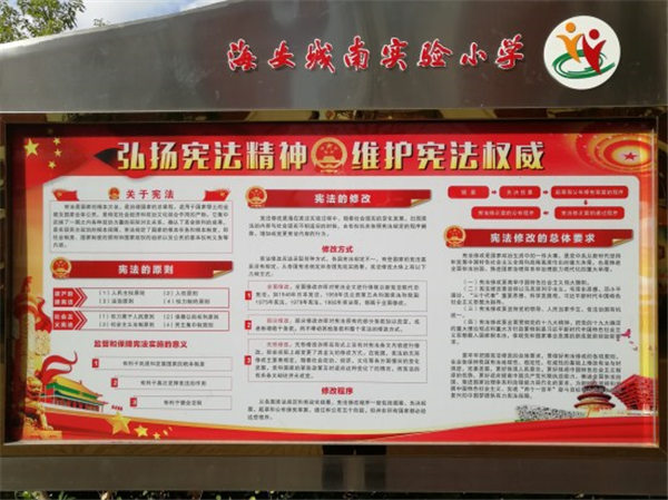 4.学校更新一期以《宪法》为主题的宣传橱窗。学校总务安保处和德育处根据本次“青少年法治宣传月”的主题,制作了两块以《宪法》为主题的宣传板,放在橱窗内供师生学习。