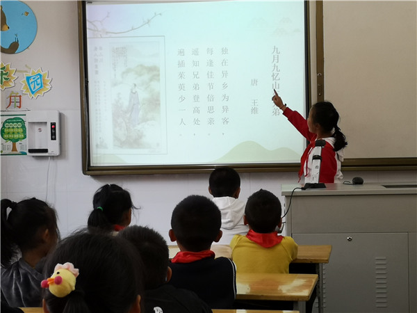 队员们将搜集到的重阳节知识以手抄报的形式记录下来,并粘贴在教室外的走廊上,形成了一道独特的风景。有些队员还在家长的指导下,把了解到的重阳节知识制作成了PPT,在少先队活动课、晨会课上进行了交流分享。活动中,队员们第一次感受到重阳节历史的悠久、文化的丰厚。