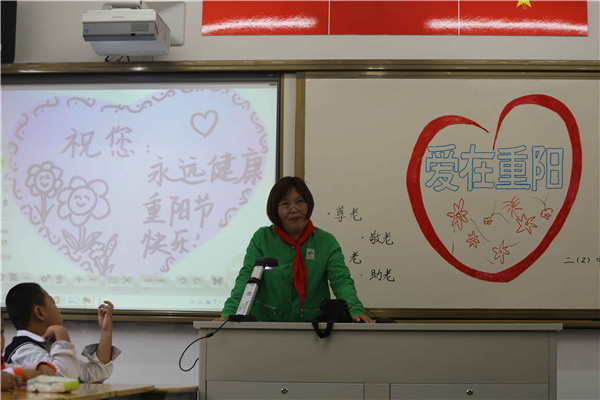 重阳节当天下午,每个中队还邀请了8位爷爷奶奶来到学校。为了准备这次活动,老师们布置黑板,队员们摆放座椅,欢欣鼓舞地迎接爷爷奶奶们的到来。队员们为爷爷奶奶系上了红领巾,表演了许多拿手的节目,比如唱歌、跳舞、演奏乐器、讲故事,个个大显身手。