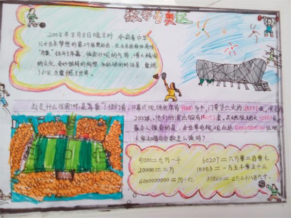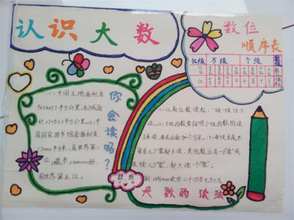 数感的培养要落实 到具体的活动中,与学生的现实生活相联系,可以使学生对大数有一个鲜明的表象,在遇到相似的情境时,他们会在头脑有一个具体的参照物,真正建立起良好的数感。学生们搜集资料,走进“大数的世界”,用一份份精美的数学小报,解读自己对大数的理解。