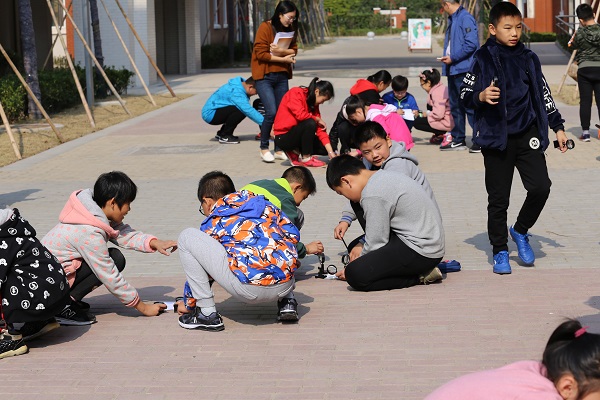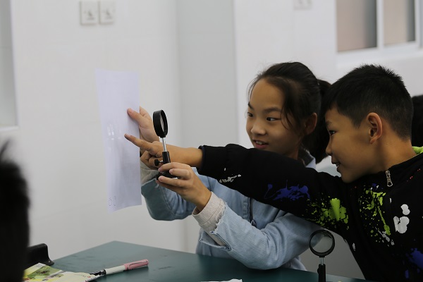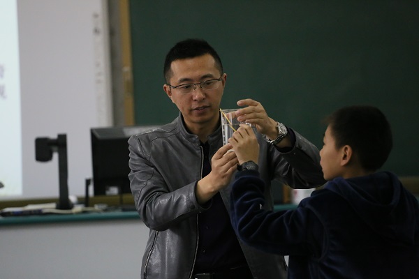 课上,张老师首先通过4道知识抢答题让学生对已学知识进行了复习,随后给学生们演示了“神奇的一滴水”的实验,即展现凸透镜的放大作用,神奇的现象引发了孩子们强烈的探究欲望,从而引出课题。在随后的“观察一杯水”的小组活动中,孩子们通过实验,观察,比较发现原来装着水的烧杯也是一个凸透镜,里面蕴含着光的折射原理。接下来孩子们自主研究了透镜,通过找相同点,比不同点,画平面图,研究成像和聚光性等一系列活动认知透镜。最后,张老师还联系实际让他们找找生活中的透镜,让课内知识应用于生活实际,让学生感受到生活中处处有科学。
