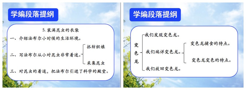 从中年级起就开始要求学生学会给文章分段,概括段落大意,意在引导学生整体把握文本内容,理清文章脉络。但是,编列提纲对学生来说却是个陌生的概念。怎样通过浅近的方式让学生了解什么是提纲?从而自己学会编列提纲呢?倪老师联系前几个单元学过的课文,以几种不同的编列提纲的方式呈现给学生,让学生一目了然。