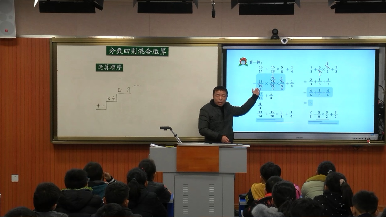 11月28日上午第一节课,杨长军老师在录播教室执教了校内课——《分数四则混合运算》。