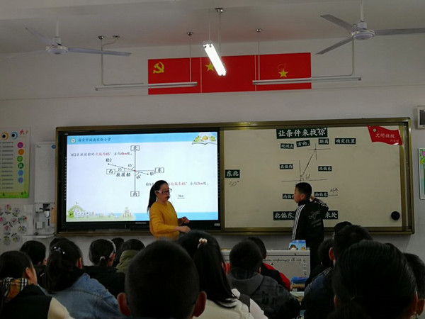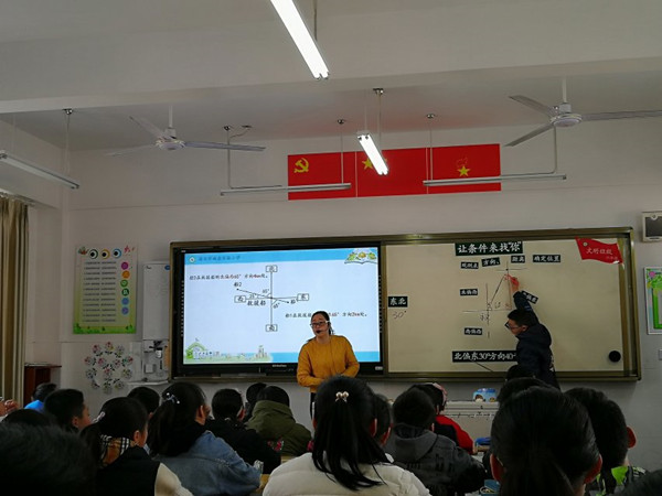 毛胜洁老师执教校级课六下《确定位置》 发布时间:2019-04-17 00:00:00 浏览次数: 次 【字体:小 大】 2019年4月11日,六年级组毛胜洁老师公开执教一节《用方向、距离确定位置》,课堂教学中老师注重情境的引入,先在一行中利用“右数第5个”条件寻找小魔豆的位置,又在一群中利用“数对”的条件寻找小魔豆的位置,最后引出在茫茫大海需要什么条件才能确定小魔豆的位置。关注知识结构的构建,确定位置就需要一些相关的条件,有了必要的条件就可以准确的描述确定位置。整节课流程自然、清晰。 分享到: 【打印正文】