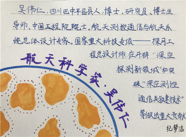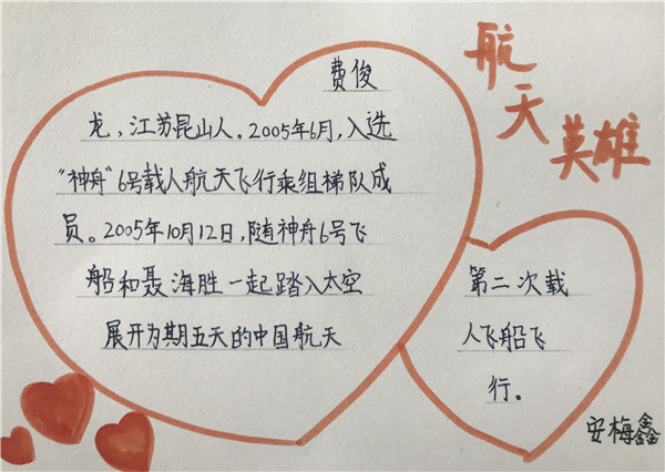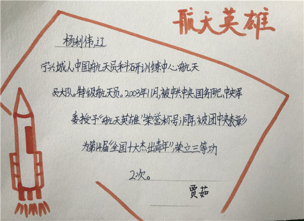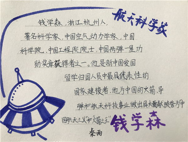 祖国的航天事业发展得如此迅速多亏了有你们啊!你们是我心中最可敬的人。我们用小卡片搜集了许多关于你们的故事,原来,你们为了航天事业吃了不少苦,受了不少累呢。