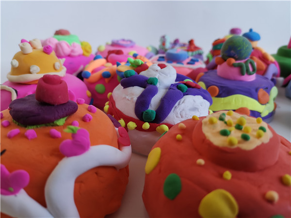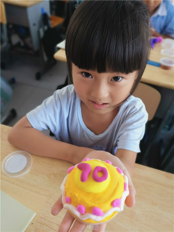 揉一揉、捏一捏,搓一搓、卷一卷,一个个造型别致、色彩鲜艳的彩泥蛋糕就做好了。你看,火箭造型的蛋糕多有趣,它载着我的“飞天梦”驶向浩瀚的宇宙。