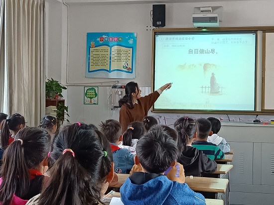 10月22日上午,二年级部吴小琴老师在二(7)班教室执教组内教研课《登鹳雀楼》。这首五言绝句前两行写景,后两行寓理于诗,写出诗人积极向上的精神,道出只有站得高才能看得远的人生哲理。本课教学重点是正确、流利地朗读古诗,想象古诗描绘的画面,明白其中道理。吴老师先介绍鹳雀楼得名的原因,再让学生读课题,学生就能正确地将课题读正确。教学古诗前两行时,让学生想象作者所看到的景象,从而感受画面的壮观,学生就能更好地读出诗的韵味。如何让学生更好地理解古诗所蕴含的道理呢?教者插入了本诗的写作背景,从而让学生感受到作者积极向上的认识态度,明白道理。本课共五个生字,三个带有撇画的字集中学习,两个字随文识字,从而将生字教学落到实处。