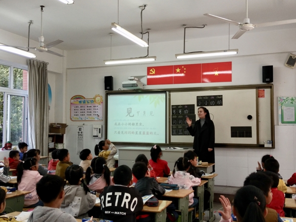 11月1日上午第一节课,刘宏越老师在一(4)教室执教组内课。整节课基于儿童心理特点,以趣促学。