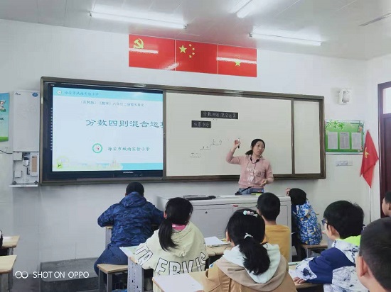 11月6日上午第一课,六年级部张杰慧老师在六9教室执教了数学组内教研课《分数四则混合运算》。