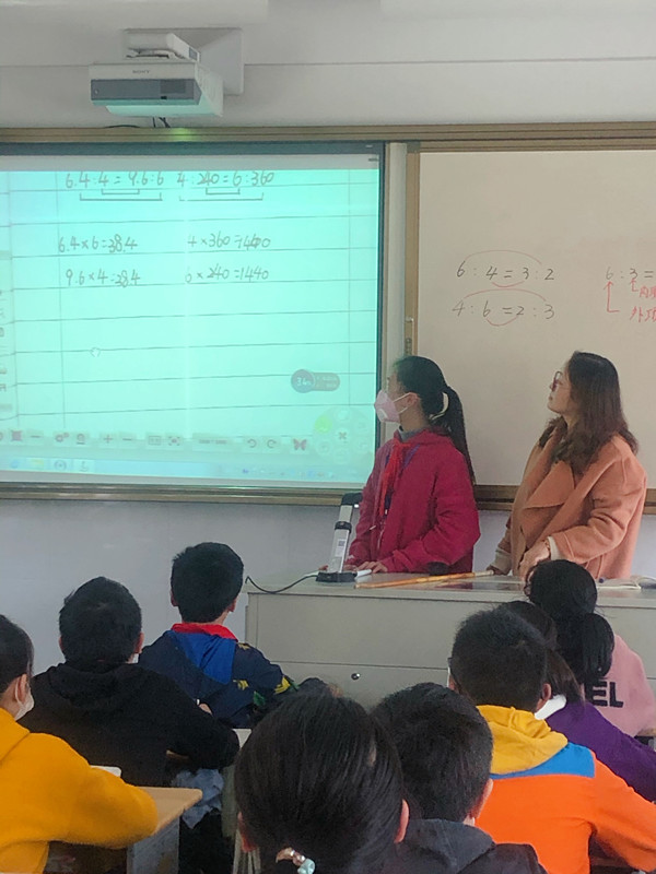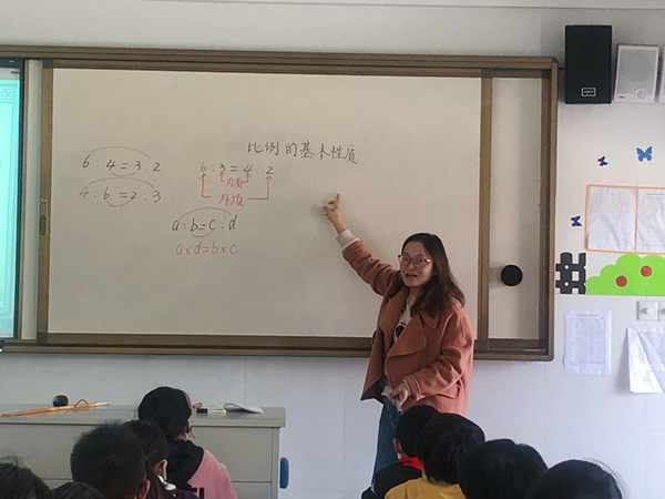 4月16日,李小芹老师在六12班开设组内研讨课《比例的基本性质》,徐仁凤主任和高数组全体数学老师参与听课评课活动。