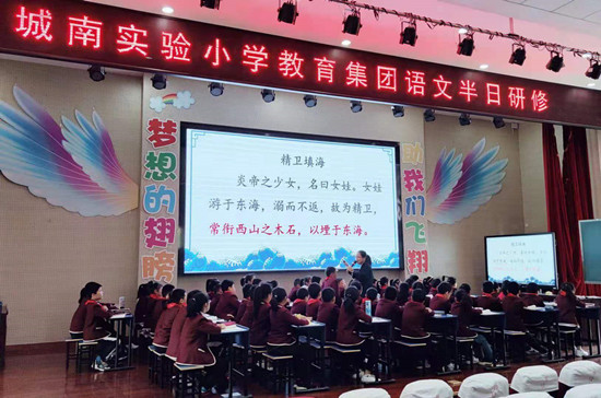 10月20日下午,城南实验小学西校区丁伍红老师在本部校区执教集团课《精卫填海》,集团全体语文老师参加了本次半日研修活动,略阳县赴海学习教师团队观摩了课堂,活动由储玲玲主任主持。《精卫填海》是神话单元的一篇文言文,丁老师紧扣单元要素,结合语文要素,引导学生在读中理解、感悟。“联系已知,激趣导入”将学生引入本课的学习;“初读课文,读通读顺”扫除了阅读障碍,多种方式的朗读,激发了学生的阅读兴趣;“读懂课文,说出意思”,引导学生借助注释,联系画面,读懂课文意思,又勾连已学的文言文,感受“一词多义”“倒装”的文言现象,感受文言文的奥秘,激发学习文言文的热情;“发挥想象,练讲故事”,启发学生抓住动作,想象细节。对比精卫和大海,想象小鸟面对大海的对白。创设情境,感受精卫面对困难的所作所为;“体验形象,感受精神”,引导学生结合课文,交流精卫的性格,抓住文本的关键句,感受人物性格。通过思辨的思维风暴,感受神话的特点。由其他神话,寻找精卫的影子,与课初始的环节相对应。最后引导学生在现实生活中寻找精卫的影子。整节课,丁老师引导学生在层层递进的朗读中,将学生的思维引向深处,将乐学善学的种子撒入心间。