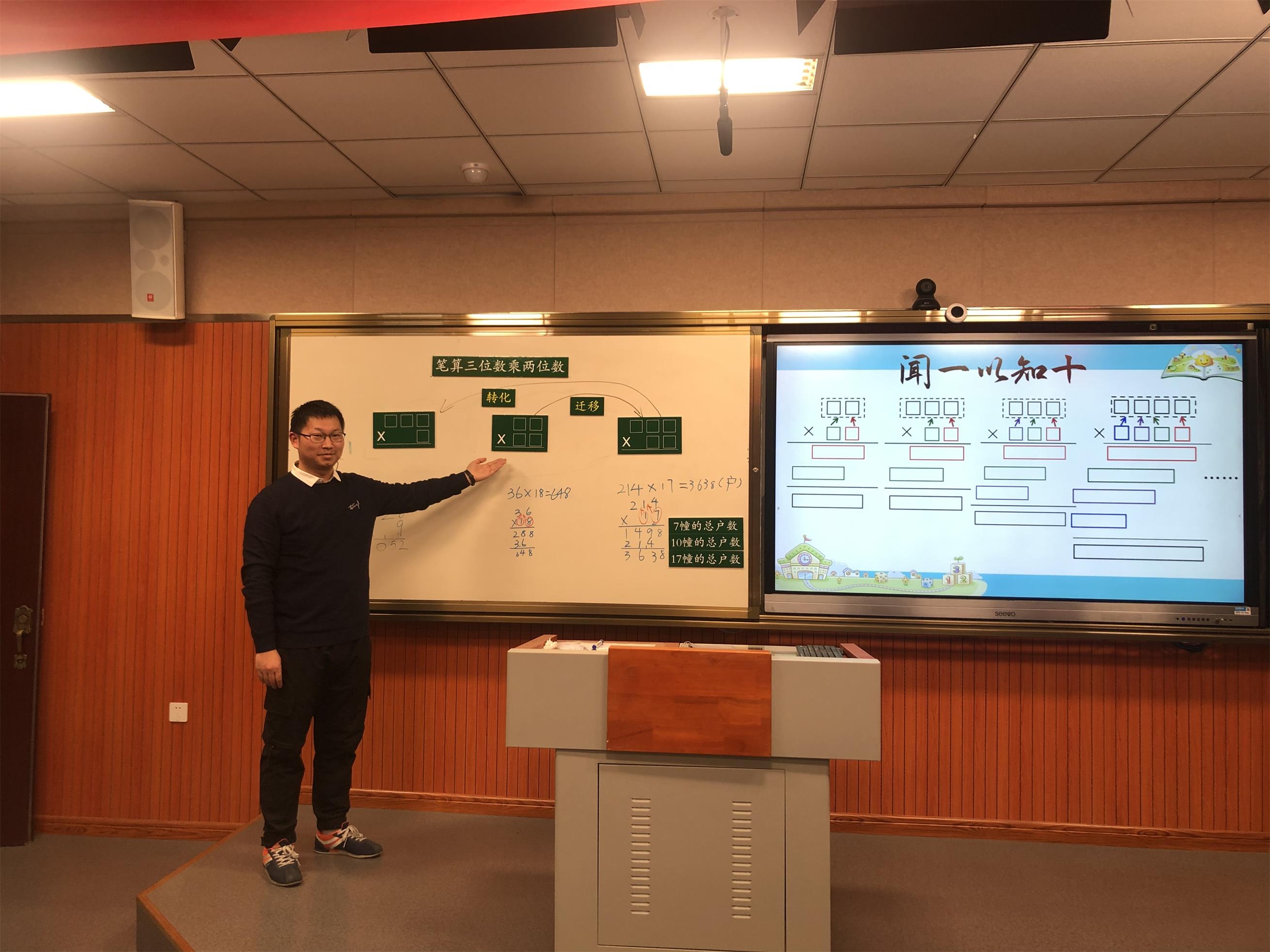 四年级石明诚老师执教数学校级课——《笔算三位数乘两位数》 发布时间:2021-06-17 00:00:00 浏览次数: 次 【字体:小 大】 四年级部石明诚老师在录播教室执教了校级课——《笔算三位数乘两位数》。石老师通过复习两位数乘两位数、三位数乘一位数引入,重视了学生的已有经验;创设情境、学习新知,注意采用学生身边的数学例子;小组讨论,组内交流,全部汇报交流,深化新知;最后巩固练习、课堂小结,形成系统达成教学目标。 分享到: 【打印正文】