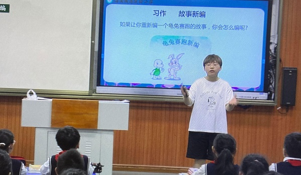 2021年6月4日上午,四年级语文组丁洁老师在校录播教室执教了一节校级作文课——《故事新编》。这是统编版四年级下册第八单元的习作,对于四年级的学生来说,童话写作并不陌生,这种充满想象的故事创编,是他们所喜爱的。但本次童话习作侧重于一个“新”字,是老故事新编。