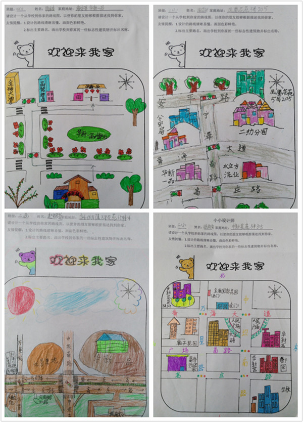 《新课程标准》中明确指出在小学数学教学中增设“实践活动”,这既是适应的改革的需要,也是数学教育的必然,培育学生的创新意识和实践能力,强调让学生做数学比让学生知道数学事实更重要。本月,我们二年级教研组在孩子学习了《认识方向》,认识了平面图上东、南、西、北以及东南、东北、西南、西北八个方向的基础上开展了一次数学实践活动:《小小设计师》,让每个孩子动手设计一个从学校到你家的路线图,并用数学的语言准确地描述出学校到你家的路线,以便可以让你的朋友根据设计的路线图和语言描述准确、快捷地找到你家所在的位置。设计的要求:1、设计的路线图清晰易懂,画面色彩鲜艳;2、标出主要路名,画出学校到你的一些标志性建筑物名称。本次活动,孩子们积极参与,精心设计、认真绘画,出现了大量的优秀的设计作品。同时,孩子们在参与设计的活动过程中各方面的能力也得到了相应地发展和提高。