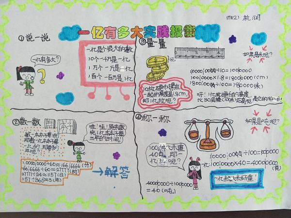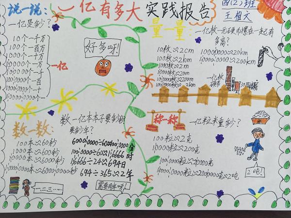 孩子们纷纷表示:“不做不知道,一做吓一跳!”原来一亿真的好大好大啊。在活动中学生不仅真正感受到一亿到底有多大,同时学生还掌握了以部分推算整体的数学思想,一幅幅精彩的实践报告记录下了孩子们的收获。