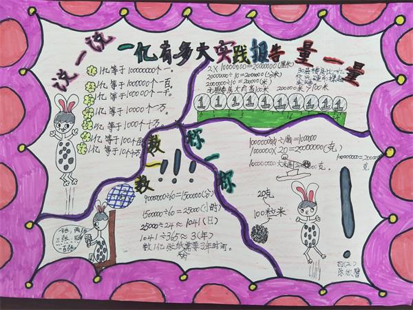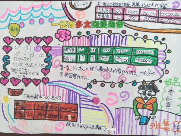 孩子们纷纷表示:“不做不知道,一做吓一跳!”原来一亿真的好大好大啊。在活动中学生不仅真正感受到一亿到底有多大,同时学生还掌握了以部分推算整体的数学思想,一幅幅精彩的实践报告记录下了孩子们的收获。