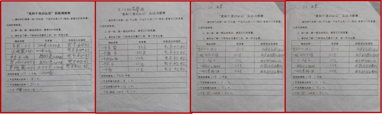 三年级在学习《千克和克》之前,老师设置了一份课前小调查,让学生找找生活中什么地方用到“千克和克”,感受1千克的物体有多重,数数有多少个,学着称一称物品的重量。在收集过程中自然而然地了解两种质量单位的不同用法,丰富了学生的直观体验。