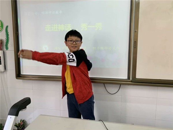 孩子们天生爱听故事,爱讲故事,更爱演故事。神话让课堂充满神奇的诱惑,让孩子们的创造力得到延展,使他们的好奇心与追求光明、追求不平凡的天性得以张扬。看,浸润在神话中的孩子们,大胆地走上了舞台,为神话人物代言,让人身临其境;把自己喜欢的神话故事搬上舞台演一演,使神话人物活灵活现;开展我与神话人物玩穿越活动,激发孩子们学习神话故事的热情,浸入式畅游神话故事。